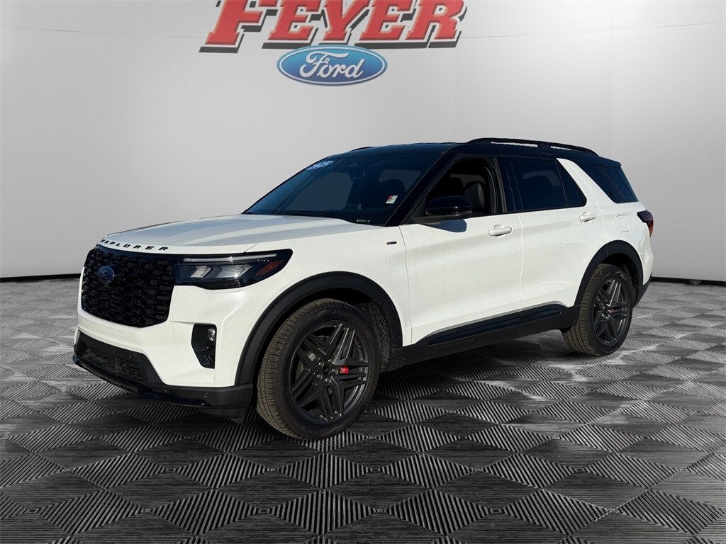 Star White Metallic Tri-Coat 2025 Ford Explorer ST-Line RWD 10-Speed Automatic 2.3L EcoBoost I-4 Pre-Collision Assist with Automatic Emergency Braking w/Pedestrian Detection, Adaptive Cruise Control/Lane Centering System, Bluetooth (Handsfree) Phone, Ford Digital Experience, Google Assistant, Google Maps, Google Play, Waze Navigation Integration, Apple CarPlay® and Android AutoTM Wireless Compatibility, 13.2" Color LCD Touchscreen, Alexa Built-In, SiriusXM Satellite Radio, Voice Controlled iPod/Mp3 input/USB port, Ford CoPilot 360, Heated Rear Seats, Keyless Entry Keypad, 360-Degree Camera, Lane Keeping System, Automatic High-Beam Headlamps, FordPass Connect w/5G Modem, Wi-Fi Hotspot, Wireless Charging Pad, Blind Spot Information System (BLIS), Rain-Sensing Windshield Wipers, Rear View Camera, Explorer ST-Line, 110V/150W AC Power Outlet, 2nd Row Heated Seats, Ambient Lighting, Auto High-beam Headlights, Auto-Dimming Interior Rear-View Mirror, Black Painted Roof, Equipment Group 300A Standard Package, Front dual zone A/C, Memory Driver's Seat, Navigation System, Performance Brakes, Power Liftgate, Power-Folding Sideview Mirrors w/Autofold, Premium Package, Rain-Sensing Wipers (Front Only), Red Painted Perf Front & Rear Brake Calipers, ST-Line Street Pack, Wheels: 21" Magnetite-Painted Aluminum, Wireless Charging Pad.